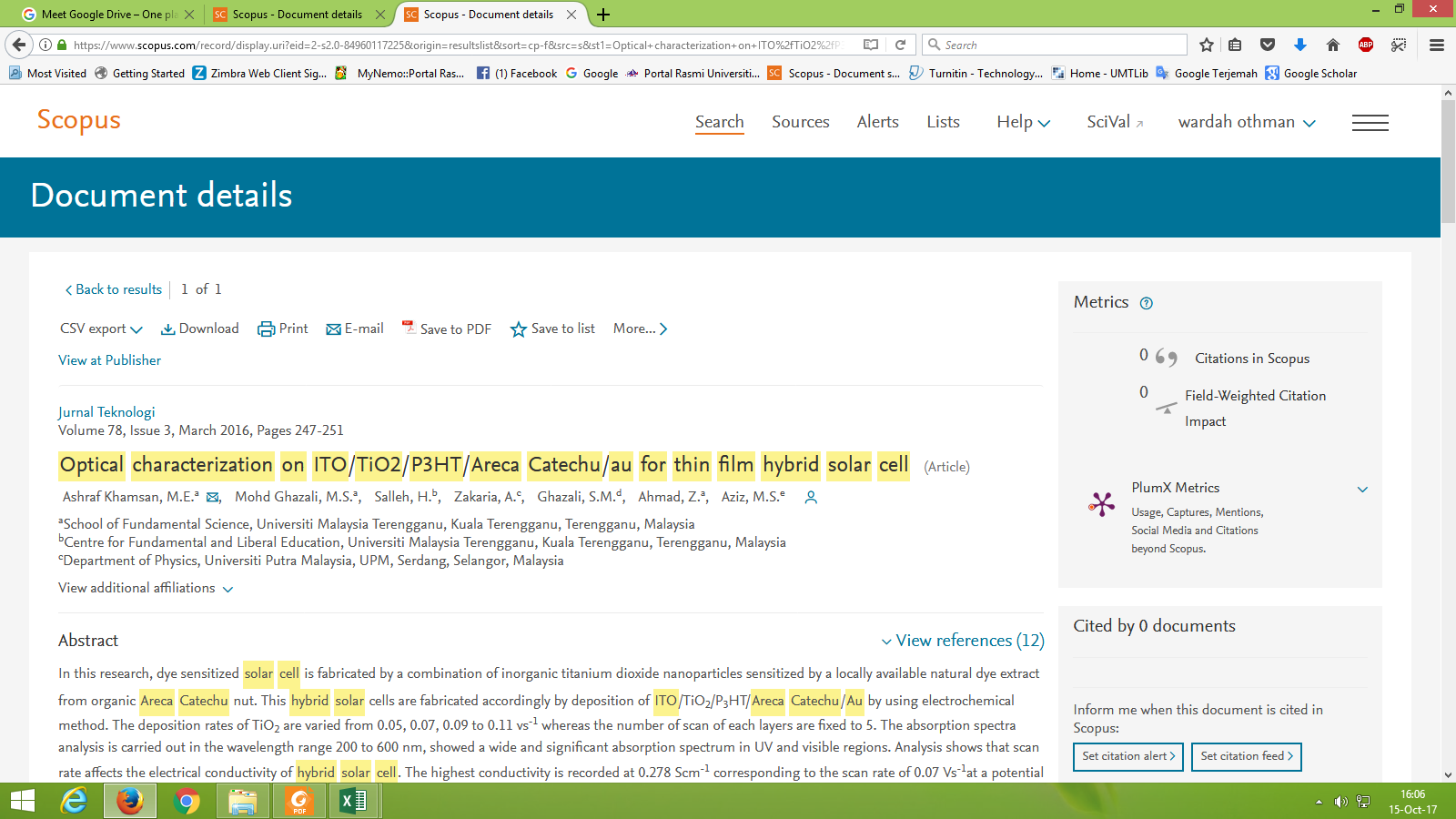 http://umt-ir.umt.edu.my:8080/handle/123456789/5790| Title: | Optical Characterization On Ito/Tio2/P3ht/Areca Catechu/Au For Thin Film Hybrid Solar Cell |